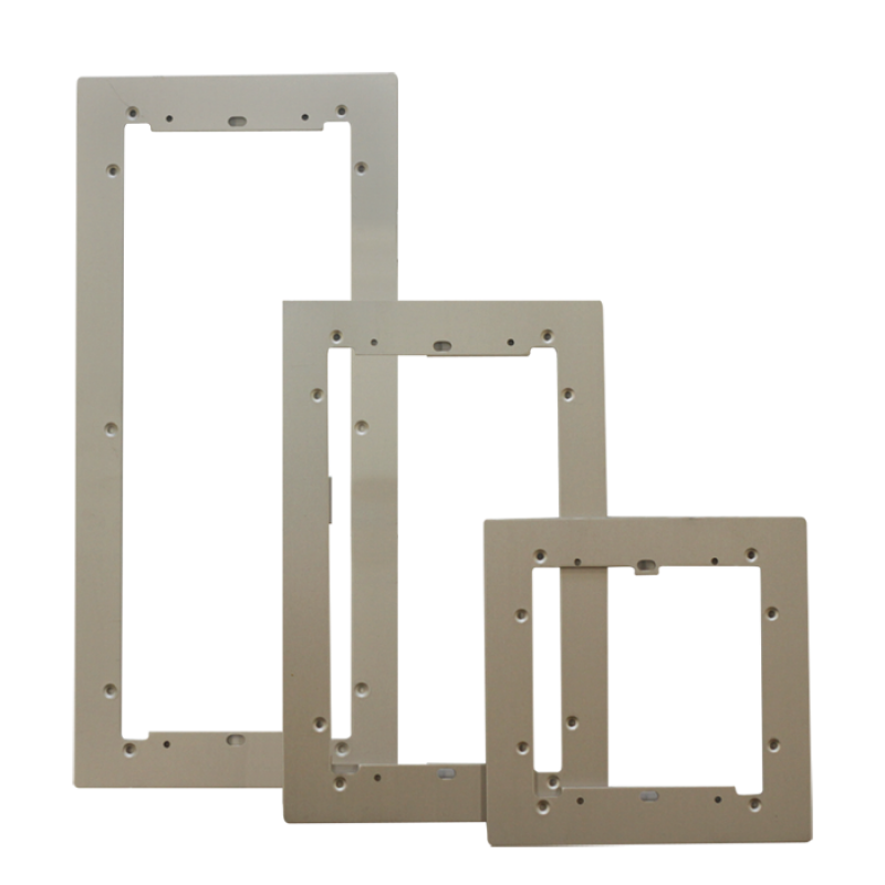Caixilho em alumínio anodizado natural, para 6 módulos. Garante resistência e durabilidade, proporcionando um acabamento discreto e elegante. Dimensões: 276 x 329 x 3 mm.