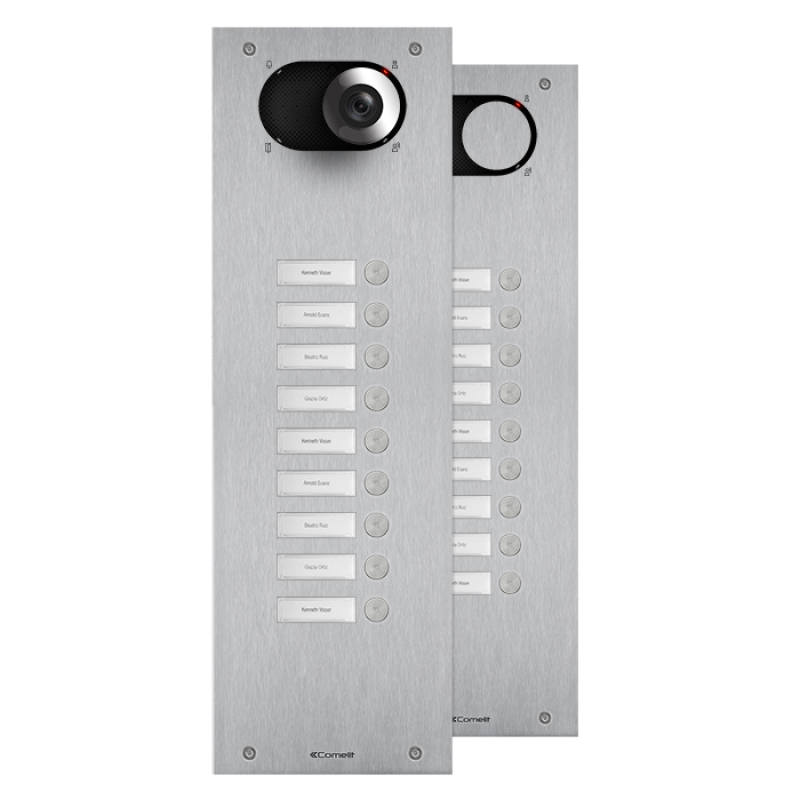 Painel frontal para botoneira Switch em aço inox AISI 316 escovado, com 2,5 mm de espessura, garantindo elevada resistência e durabilidade. Inclui 9 botões já montados e cablados, com retroiluminação das etiquetas porta-nome por LED brancos, sendo estas facilmente substituídas diretamente pelo painel frontal. Graças ao adaptador art. 1250U, incluído na embalagem, é possível utilizar módulos áudio ou áudio/vídeo (vendidos separadamente), de acordo com o tipo de cablagem — sistema digital de 2 fios Simplebus ou ViP. Apresenta grau de proteção IK08, assegurando resistência a impactos. Deve ser completado com caixa de embutir ou cobertura de parede, vendidas separadamente. Dimensões (L x A x P): 150 x 475,5 x 2,5 mm.