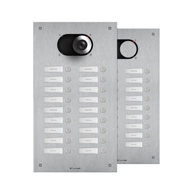 Painel frontal para botoneira Switch em aço inox AISI 316 escovado, com 2,5 mm de espessura, garantindo elevada resistência e durabilidade. Inclui 18 botões, distribuídos por 2 colunas, já montados e cablados, com retroiluminação das etiquetas porta-nome por LED brancos, sendo estas facilmente substituídas diretamente pelo painel frontal. Graças ao adaptador art. 1250U, incluído na embalagem, é possível utilizar módulos áudio ou áudio/vídeo (vendidos separadamente), de acordo com o tipo de cablagem — sistema digital de 2 fios Simplebus ou ViP. Apresenta grau de proteção IK08, assegurando resistência a impactos. Deve ser completado com caixa de embutir ou cobertura de parede, vendidas separadamente. Dimensões (L x A x P): 216,4 x 395,7 x 2,5 mm.