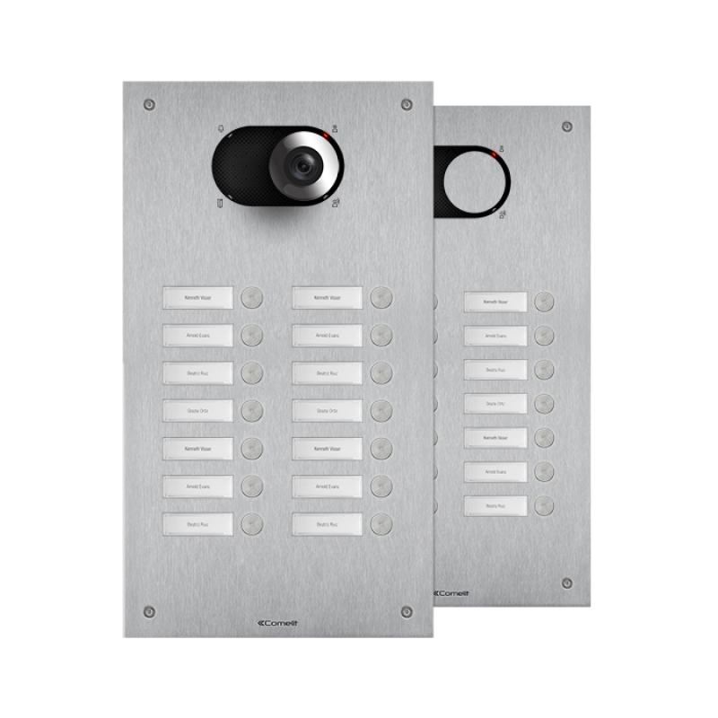 Painel frontal para botoneira Switch em aço inox AISI 316 escovado, com 2,5 mm de espessura, garantindo elevada resistência e durabilidade. Inclui 14 botões, distribuídos por 2 colunas, já montados e cablados, com retroiluminação das etiquetas porta-nome por LED brancos, sendo estas facilmente substituídas diretamente pelo painel frontal. Graças ao adaptador art. 1250U, incluído na embalagem, é possível utilizar módulos áudio ou áudio/vídeo (vendidos separadamente), de acordo com o tipo de cablagem — sistema digital de 2 fios Simplebus ou ViP. Apresenta grau de proteção IK08, assegurando resistência a impactos. Deve ser completado com caixa de embutir ou cobertura de parede, vendidas separadamente. Dimensões (L x A x P): 216,4 x 395,7 x 2,5 mm.