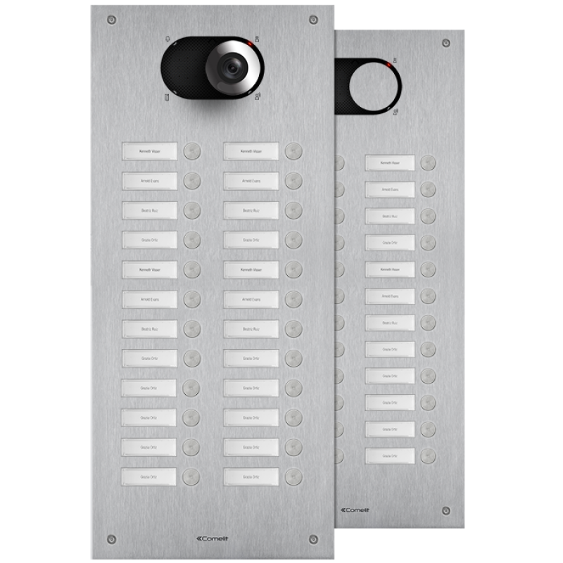 Painel frontal para botoneira Switch em aço inox AISI 316 escovado, com 2,5 mm de espessura, garantindo elevada resistência e durabilidade. Inclui 24 botões, distribuídos por 2 colunas, já montados e cablados, com retroiluminação das etiquetas porta-nome por LED brancos, sendo estas facilmente substituídas diretamente pelo painel frontal. Graças ao adaptador art. 1250U, incluído na embalagem, é possível utilizar módulos áudio ou áudio/vídeo (vendidos separadamente), de acordo com o tipo de cablagem — sistema digital de 2 fios Simplebus ou ViP. Apresenta grau de proteção IK08, assegurando resistência a impactos. Deve ser completado com caixa de embutir ou cobertura de parede, vendidas separadamente. Dimensões (L x A x P): 216,4 x 502,1 x 2,5 mm.