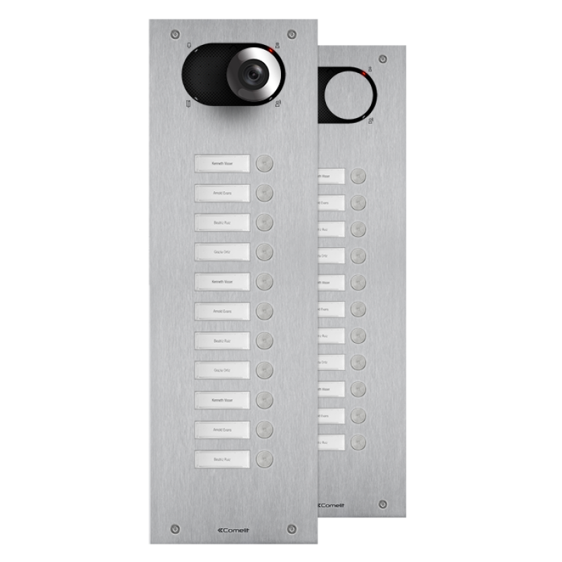Painel frontal para botoneira Switch em aço inox AISI 316 escovado, com 2,5 mm de espessura, garantindo elevada resistência e durabilidade. Inclui 11 botões já montados e cablados, com retroiluminação das etiquetas porta-nome por LED brancos, sendo estas facilmente substituídas diretamente pelo painel frontal. Graças ao adaptador art. 1250U, incluído na embalagem, é possível utilizar módulos áudio ou áudio/vídeo (vendidos separadamente), de acordo com o tipo de cablagem — sistema digital de 2 fios Simplebus ou ViP.Apresenta grau de proteção IK08, assegurando resistência a impactos. Deve ser completado com caixa de embutir ou cobertura de parede, vendidas separadamente. Dimensões (L x A x P): 150 x 475,5 x 2,5 mm.