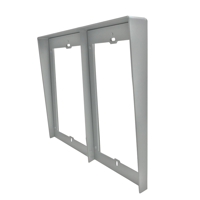 Viseira de proteção contra chuva para molduras de embutir de 8 módulos (2 suportes de 4 módulos lado a lado), compatível com botoneira Ultra. Fabricada em alumínio anodizado de cor cinza, garantindo resistência e durabilidade. Dimensões: 259 x 413 x 32 mm.