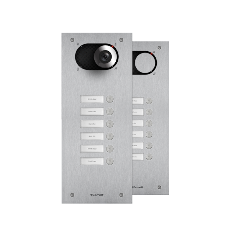 Painel frontal para botoneira Switch em aço inox AISI 316 escovado, com 2,5 mm de espessura, garantindo elevada resistência e durabilidade. O adaptador art. 1250U, incluído na embalagem, permite a utilização de módulos áudio ou áudio/vídeo (vendidos separadamente), de acordo com o tipo de cablagem — sistema digital de 2 fios Simplebus ou ViP. Inclui 6 botões já montados e cablados, com retroiluminação das etiquetas porta-nome por LED brancos, sendo estas facilmente substituídas diretamente pelo painel frontal. Apresenta grau de proteção IK08, assegurando resistência a impactos. Deve ser completado com caixa de embutir ou cobertura de parede, vendidas separadamente. Dimensões (L x A x P): 150 x 369,1 x 2,5 mm.