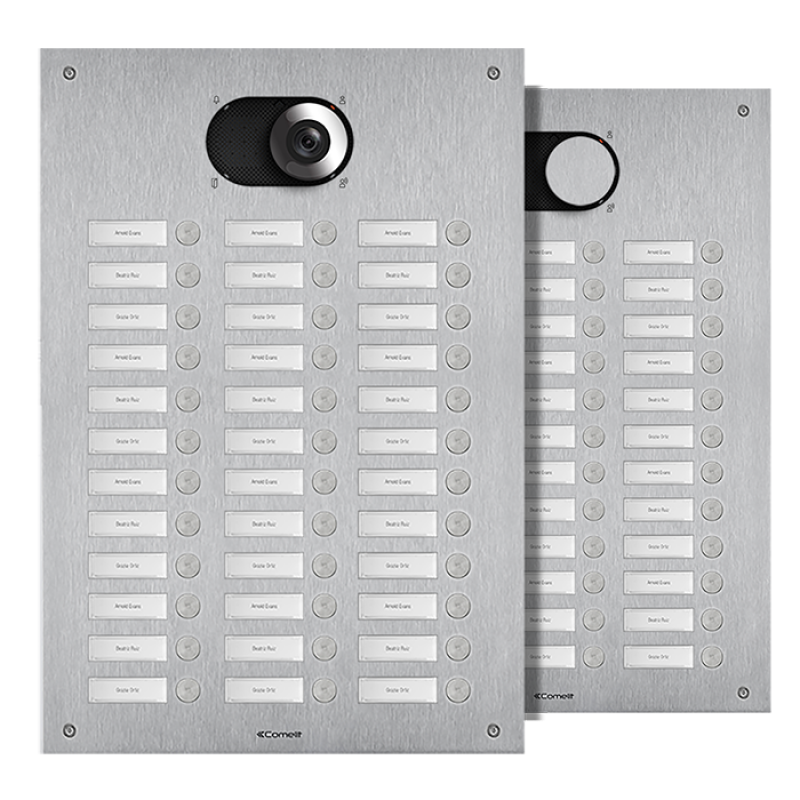 Painel frontal para botoneira Switch em aço inox AISI 316 escovado, com 2,5 mm de espessura, garantindo elevada resistência e durabilidade. O adaptador art. 1250U, incluído na embalagem, permite a utilização de módulos áudio ou áudio/vídeo (vendidos separadamente), de acordo com o tipo de cablagem — sistema digital de 2 fios Simplebus ou ViP. Inclui 36 botões, distribuídos por 3 colunas, já montados e cablados, com retroiluminação das etiquetas porta-nome por LED brancos, sendo estas facilmente substituídas diretamente pelo painel frontal. Apresenta grau de proteção IK08, assegurando resistência a impactos. Deve ser completado com caixa de embutir ou cobertura de parede, vendidas separadamente. Dimensões (L x A x P): 302,9 x 502,1 x 2,5 mm.