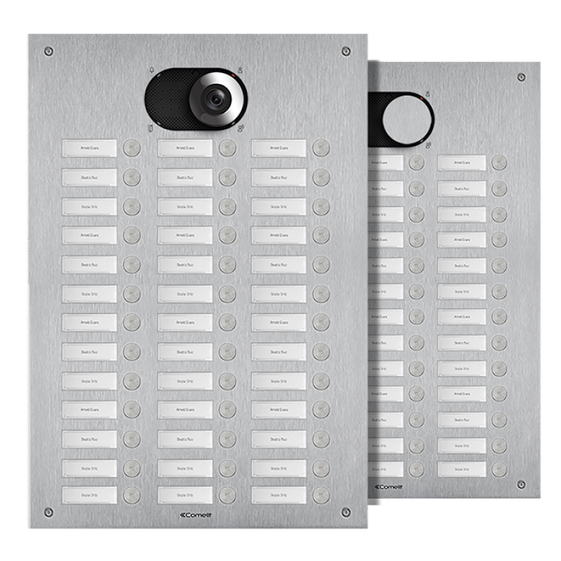 Painel frontal para botoneira Switch em aço inox AISI 316 escovado, com 2,5 mm de espessura, garantindo elevada resistência e durabilidade. O adaptador art. 1250U, incluído na embalagem, permite a utilização de módulos áudio ou áudio/vídeo (vendidos separadamente), de acordo com o tipo de cablagem — sistema digital de 2 fios Simplebus ou ViP. Inclui 39 botões distribuídos por 3 colunas, já montados e cablados, com retroiluminação das etiquetas porta-nome por LED brancos, sendo estas facilmente substituídas diretamente pelo painel frontal. Apresenta grau de proteção IK08, assegurando resistência a impactos. Deve ser completado com caixa de embutir ou cobertura de parede, vendidas separadamente. Dimensões (L x A x P): 302,9 x 502,1 x 2,5 mm.
