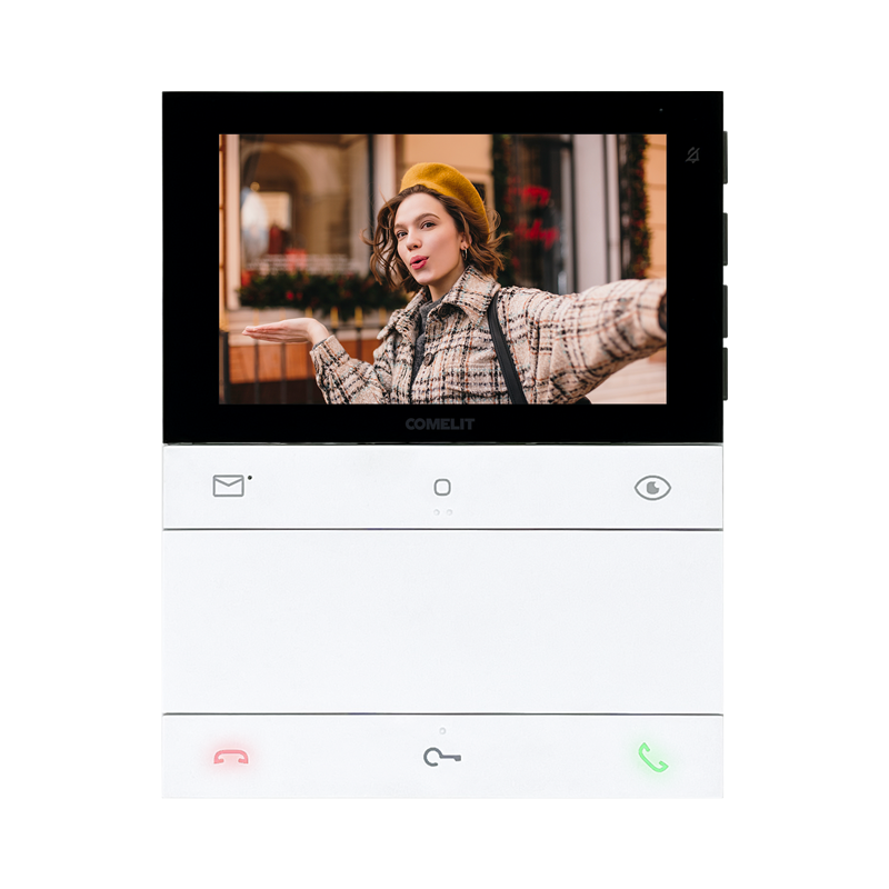 Vídeo-intercomunicador a cores da série People para sistema Simplebus2, versão mãos-livres, com ecrã de 5” em formato 16:9. Pode ser programado, mesmo quando desligado, através de smartphone com a aplicação MyComelit (download gratuito).Inclui suporte metálico para montagem na parede, garantindo uma fixação segura, e borne de derivação de linha. Dispõe de 6 botões mecânicos frontais com ícones de função pré-definida: 3 retroiluminados (verde – ativação de áudio, vermelho – fim de comunicação, branco – abertura de porta) e 3 programáveis (acesso a imagens do vídeo-atendedor, comando de atuador e autoacendimento). Os botões centrais incluem guias táteis para utilizadores com deficiência visual. No lado direito, integra comandos para ativação do modo silencioso (com indicador LED vermelho) e acesso ao menu, permitindo ajustar luminosidade, contraste, cor e volume da campainha.Inclui botão de chamada para campainha externa, também configurável para outras funções. Dimensões (L x A x P): 135 x 170 x 23 mm.
