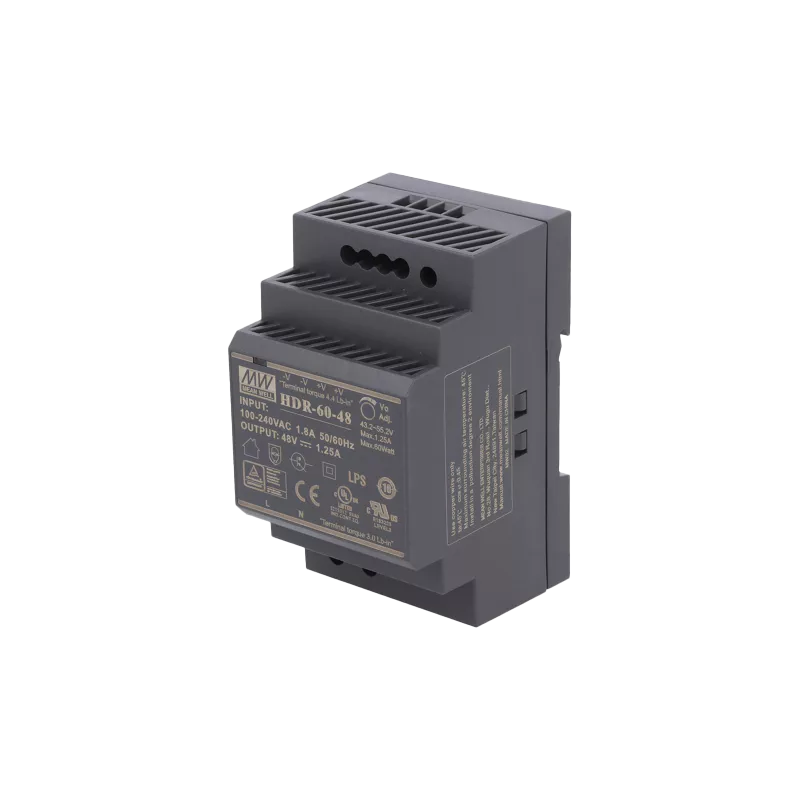 Tipo de alimentador: de impulsos Espécie de alimentador: em trilho DIN Potência: 60W Tensão de saída: 48V DC Faixa de tensão de saída: 43,2...55,2V DC Corrente de saída: 1,25A Conexão elétrica: bloco terminal Montagem: para trilho DIN Dimensões externas: 52,5x90x54,5mm Número de saídas: 1 Temperatura de trabalho: -30...70°C Segurança: Anti-sobrecarga OPP, Anti-sobretensões OVP, contra curto-circuitos SCP Eficiência: 91% Série do fabricante: HDR-60 Consumo de energia sem carga: <0,3W Tensão de alimentação: 85...264V AC / 120...370V DC